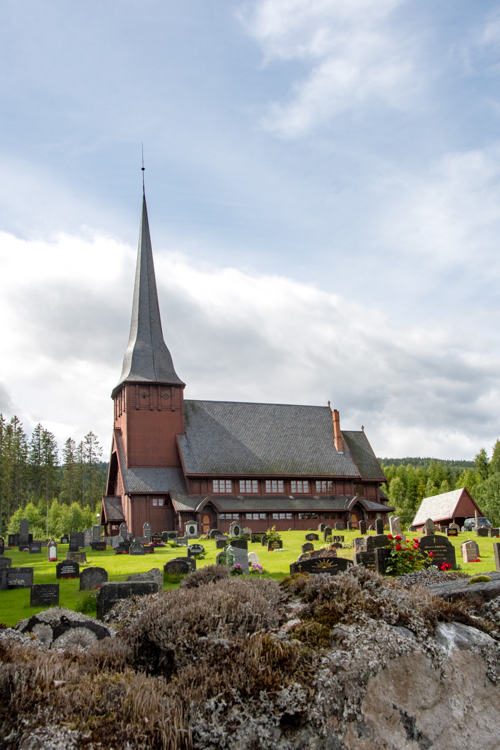 We volgen de 245 naar het noorden. Dat meer op rechts duurt echt eindeloos. Het gaat – maar – door… Tachtig km om precies te zijn. En halverwege stuiten we in Ringelia (het mag eigenlijk geen naam hebben) op de Skute Kirke; een houten kerk geopend in 1915.