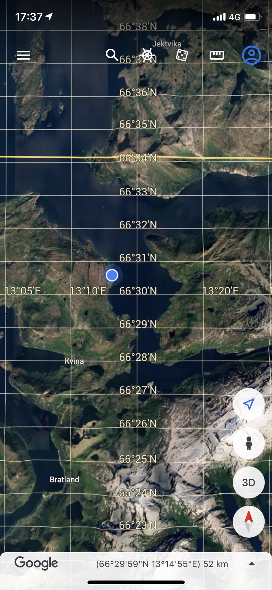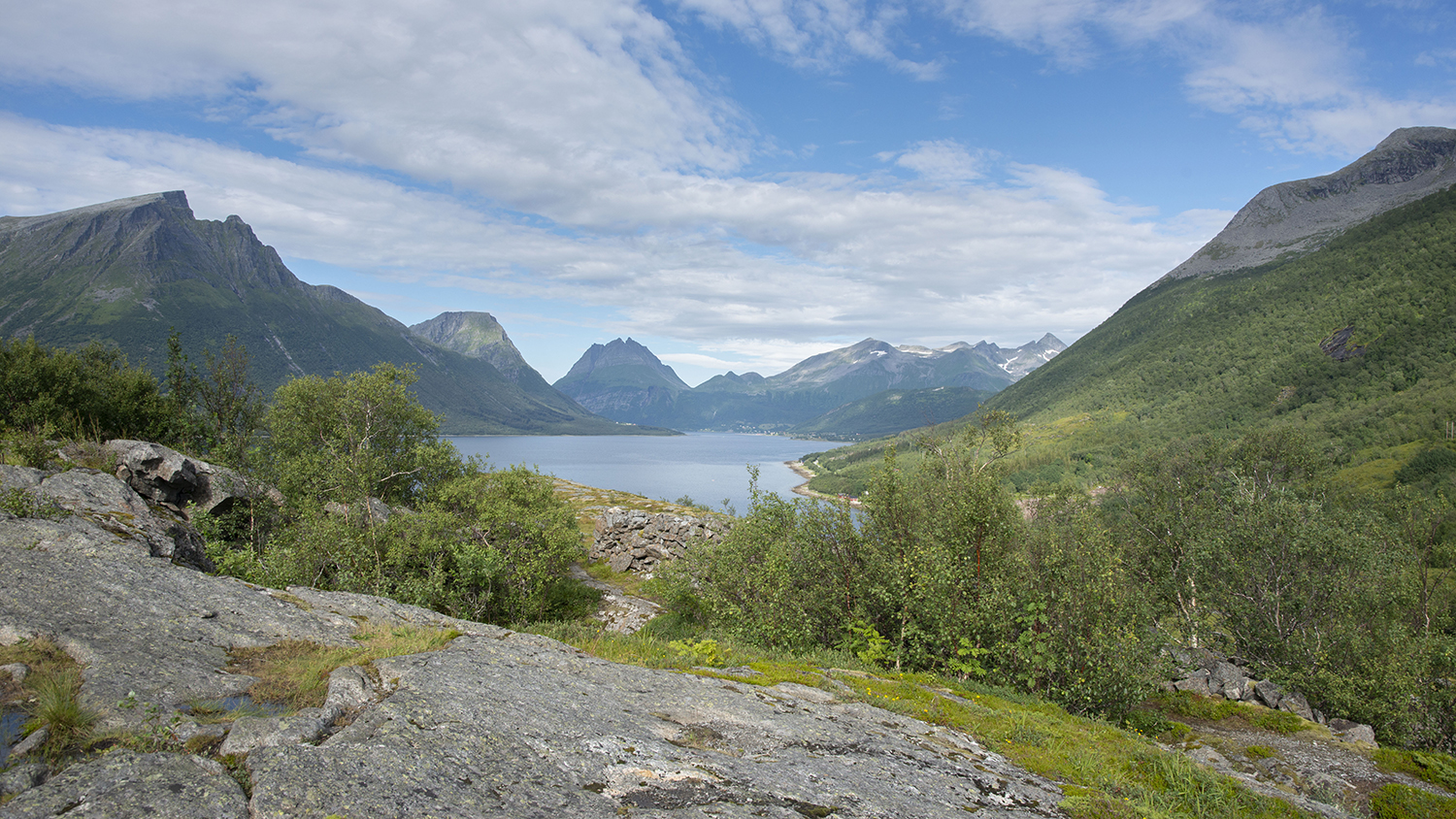 Ongelofelijk, wat hebben we een mazzel met het weer! De dag begint grijs, maar hoe noordelijker we trekken hoe meer het opentrekt. En als we de poolcirkel naderen is het werkelijk schitterend! Fris, maar niet meer dan dat. De poolcirkel redden we nét niet; we verblijven op een camping op 4,5 km ten zuiden ervan. Onderweg kunnen we om iedere bocht wel stoppen voor de platen die we kunnen schieten. Doen we niet. Op een paar plekken na.