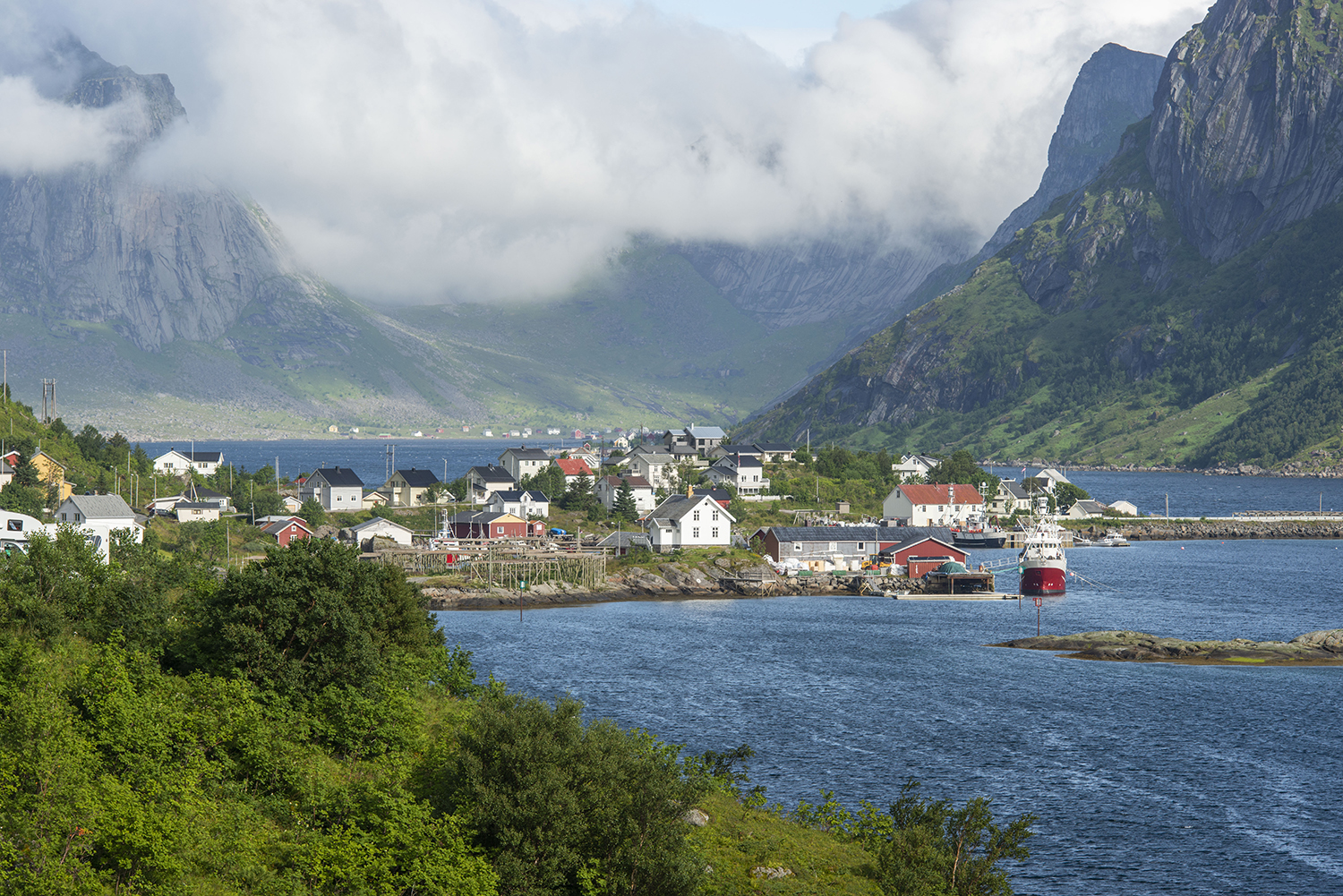 5:15 de wekker, in de kleren, hostelbed afhalen, plons water in het gezicht en hup naar de auto. Kamersleutel achtergelaten in de daarvoor bestemde box (self-checkout voor vertrek bij nacht en ontij), de deur uit, die valt natuurlijk in het slot, zoals dat hoort. K*…!! Bril vergeten (we laten in het midden wie)… De ongelukkige slaapwacht neemt na twee keer bellen op, kan Gode-zij-dank de deur opendoen en we halen nog net de boot naar Moskenes.